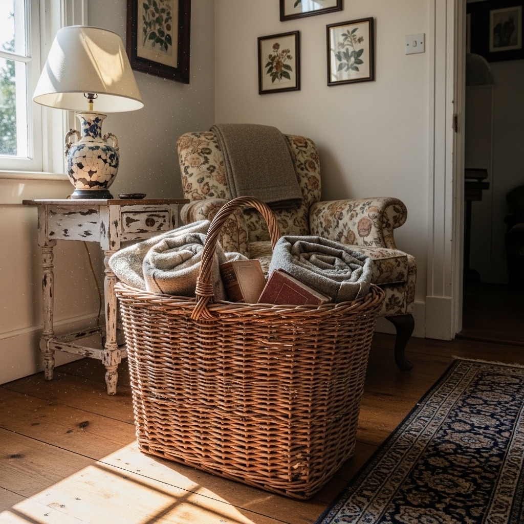 Place a large wicker basket on the floor in a corner. Use it to store blankets or magazines. The basket will add warmth.