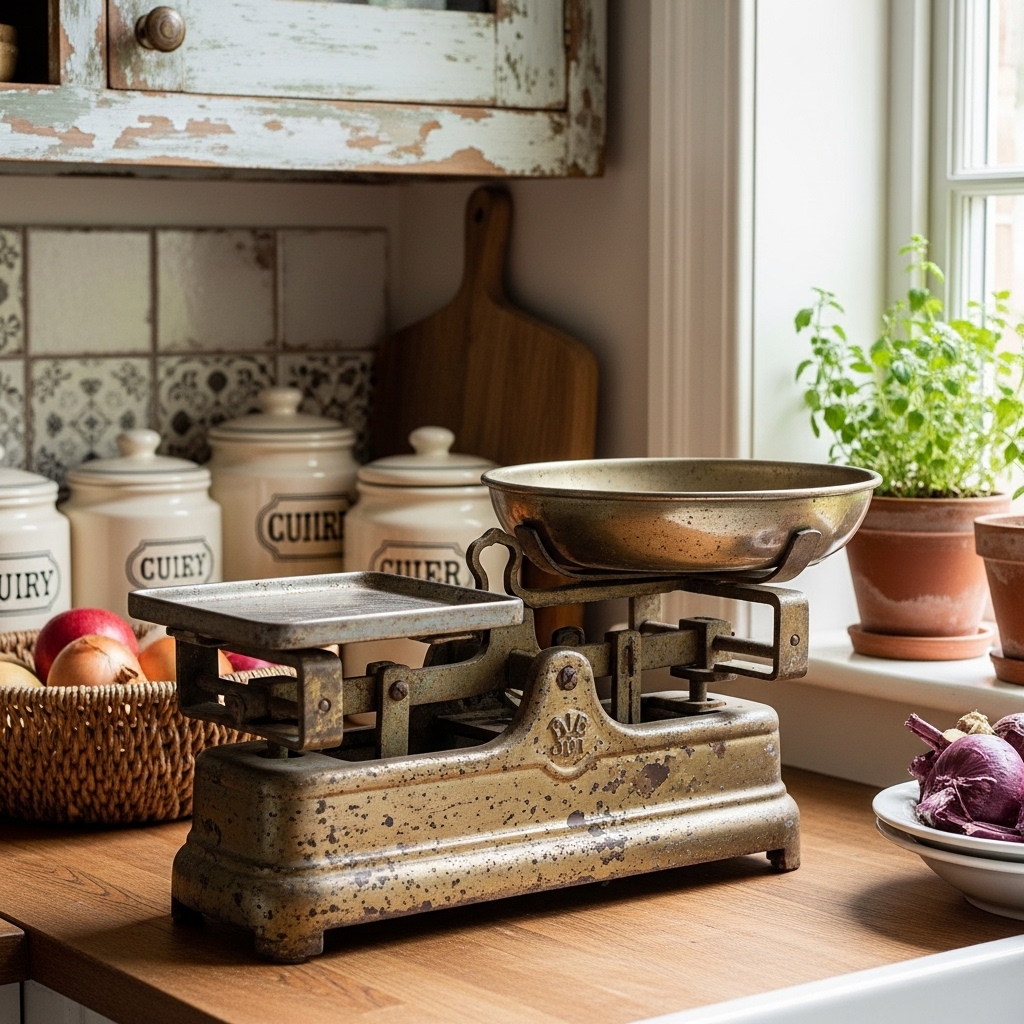 Place an old balance scale on the kitchen counter. The metal should be tarnished. The base should be cast iron.