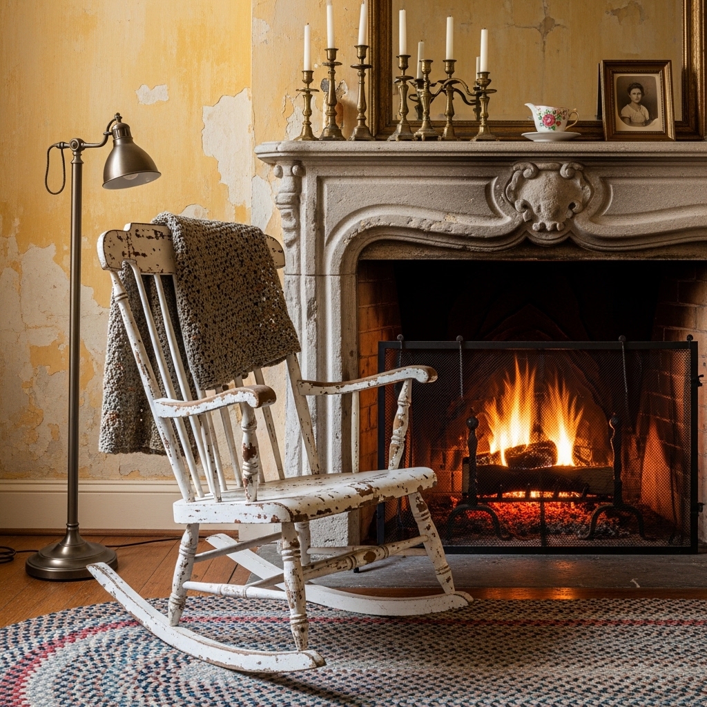 Place a wooden rocking chair by the fireplace. The wood should be worn. The finish should be crackled.