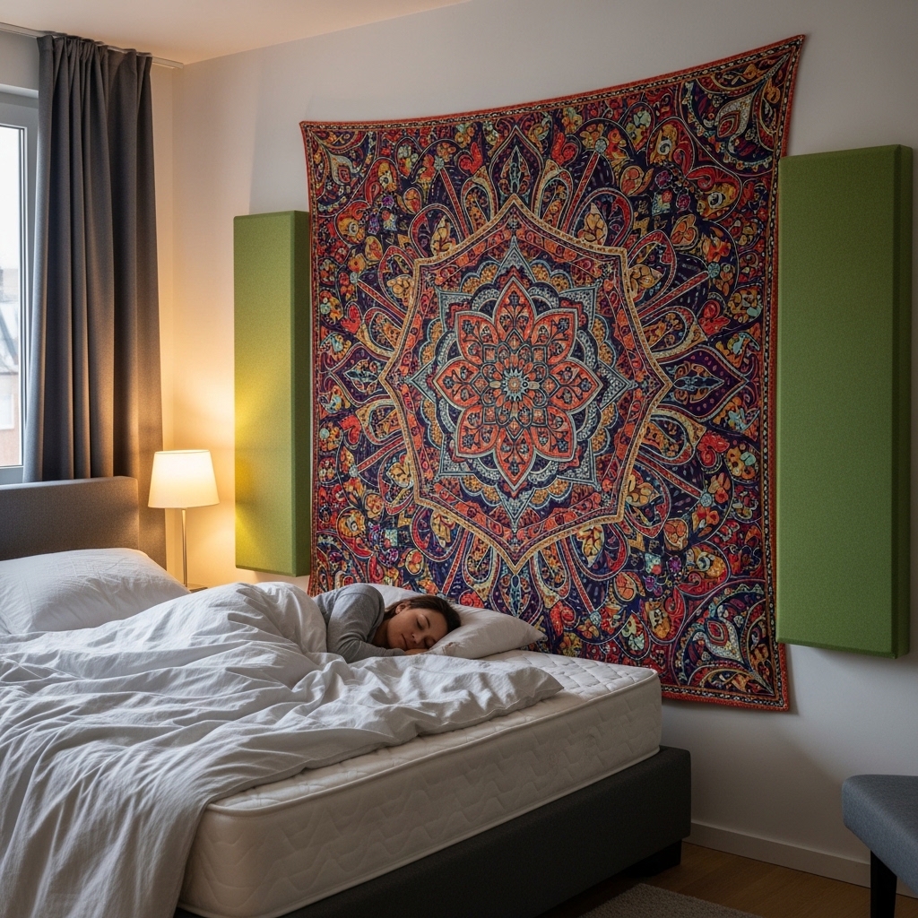 Fabric wall hangings help absorb sound and reduce echo inside the bedroom.