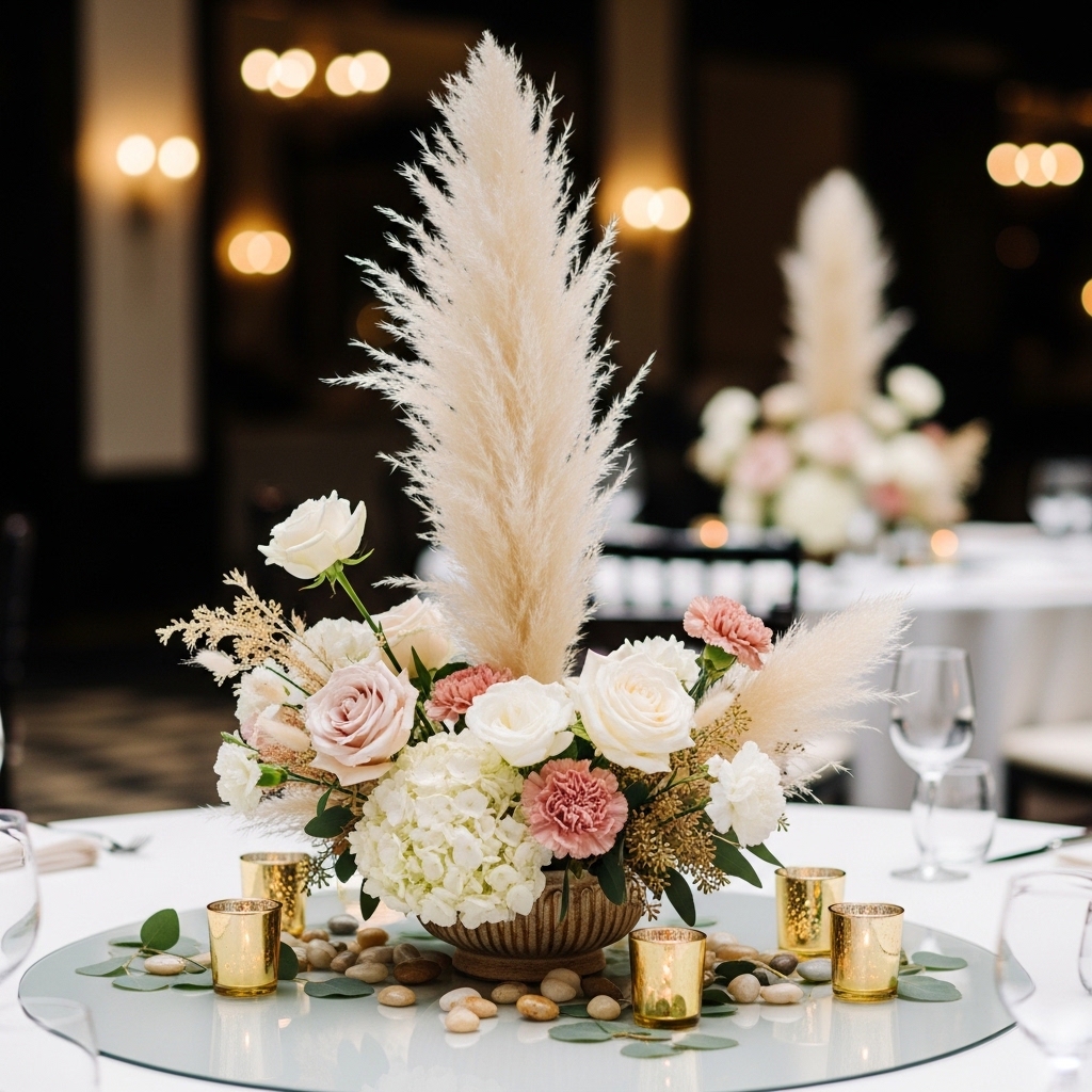 Pampas grass paired with neutral blooms creates a boho-chic wedding centerpiece.