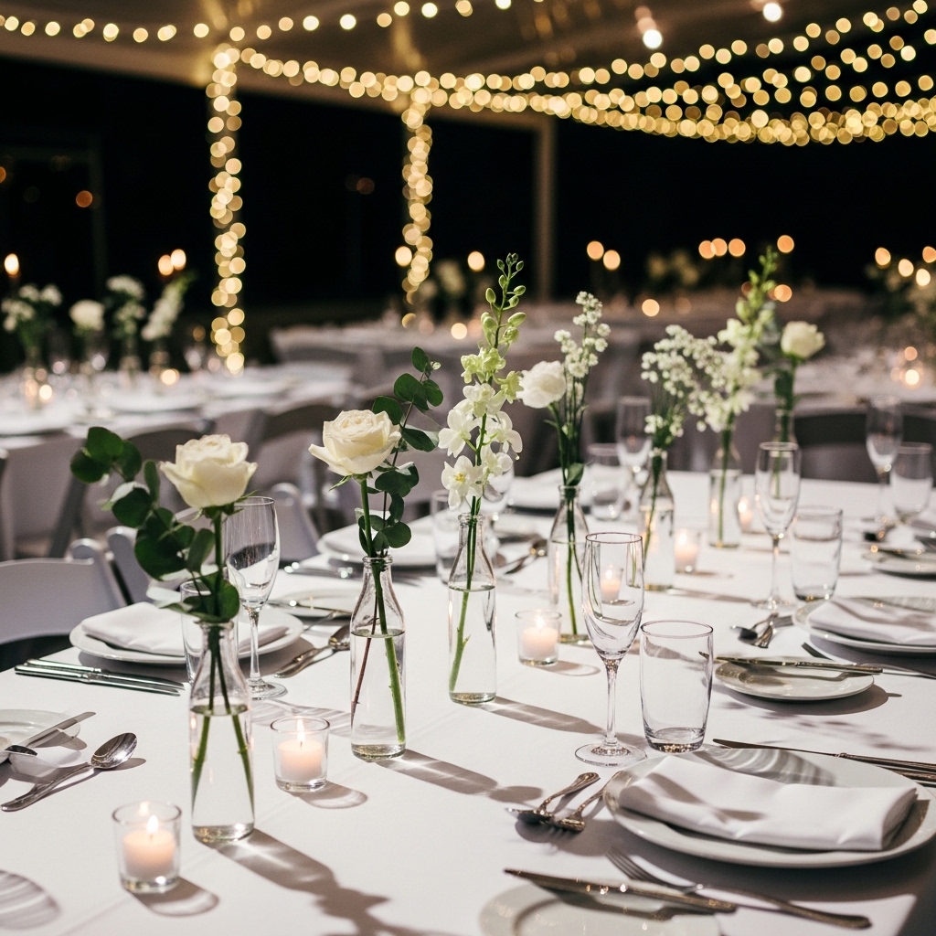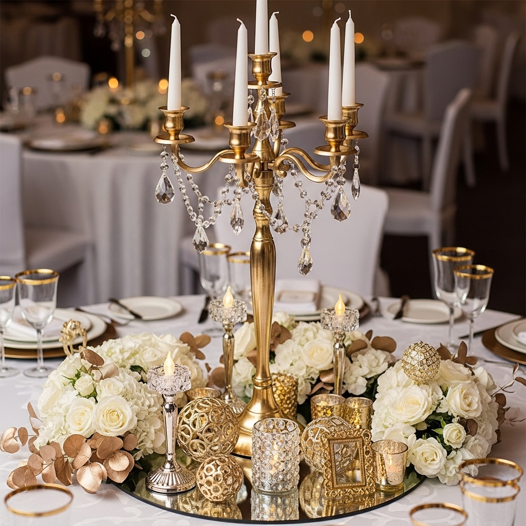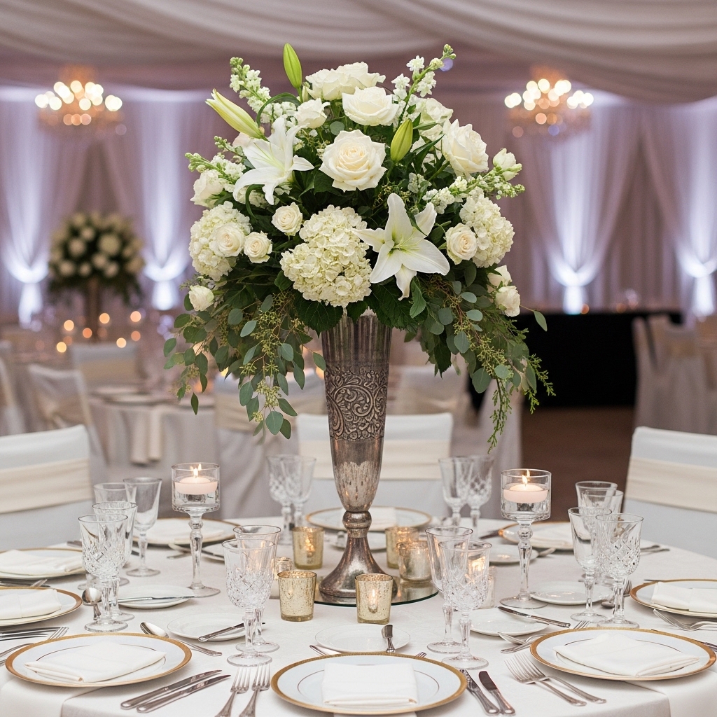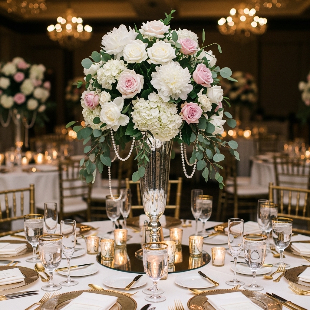 For a luxury wedding aesthetic, combine crystal vases, gold accents, and white florals.