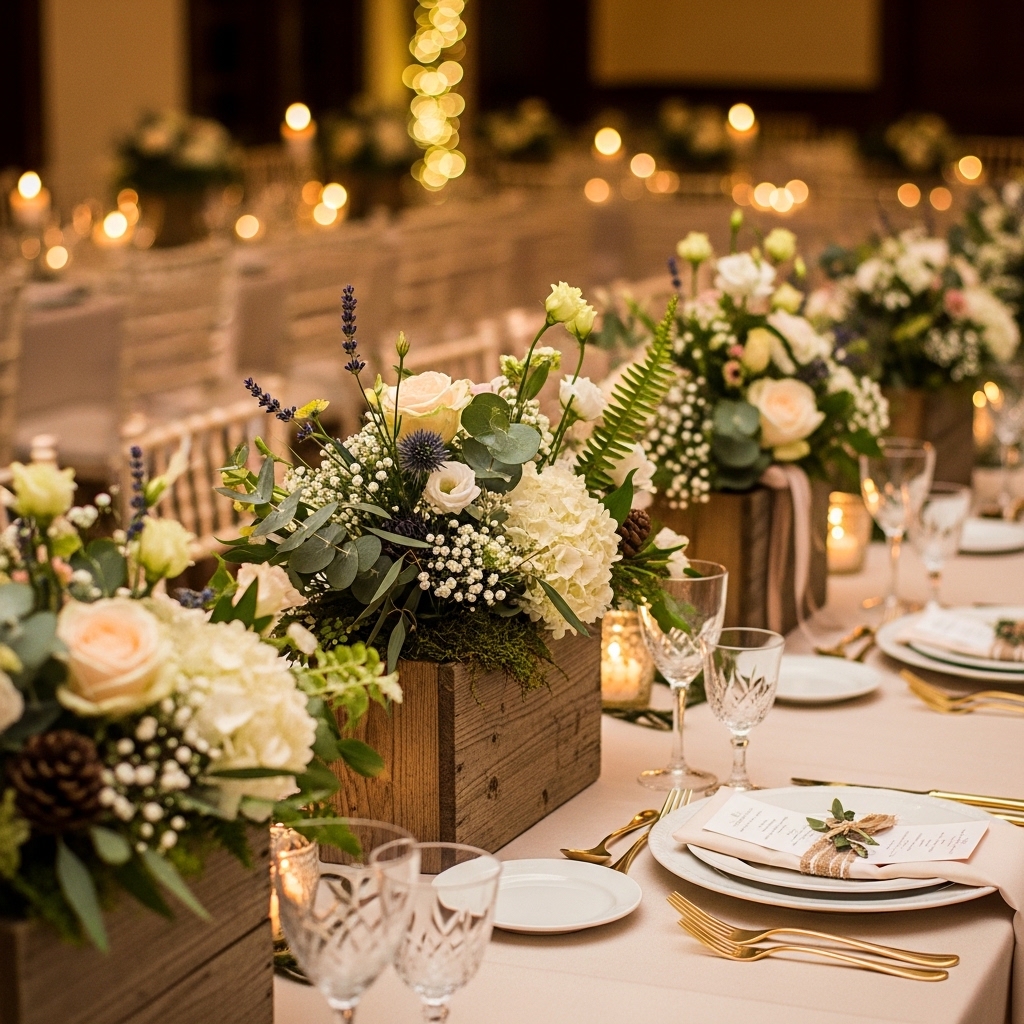 Wooden box centerpieces filled with seasonal flowers and greenery are perfect for rustic or barn weddings.