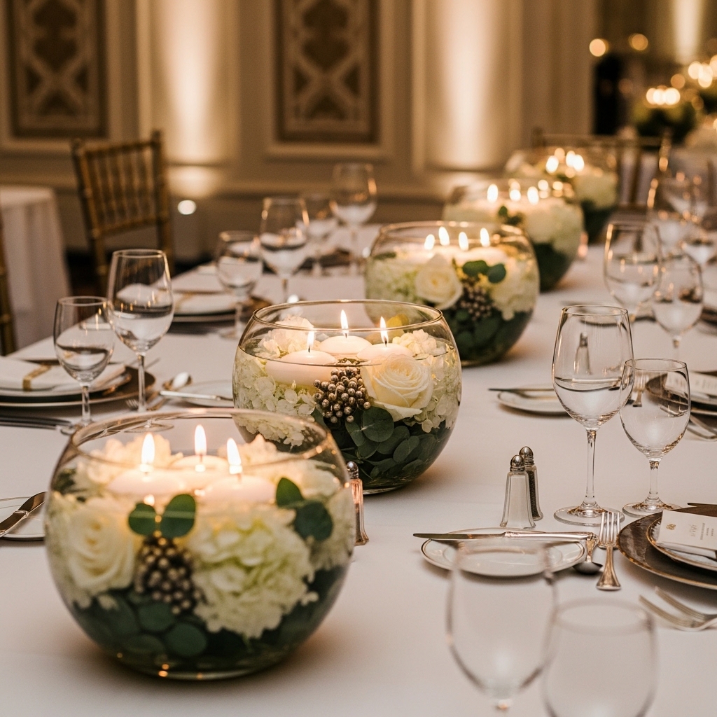 Clear glass bowls with floating candles and delicate blooms create a soft, romantic look.