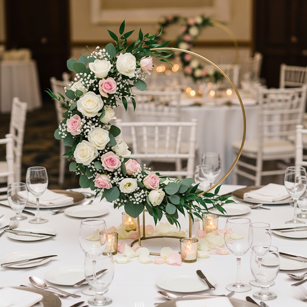 Pro Tip: Balance the hoop with soft florals concentrated on one side for asymmetrical beauty.