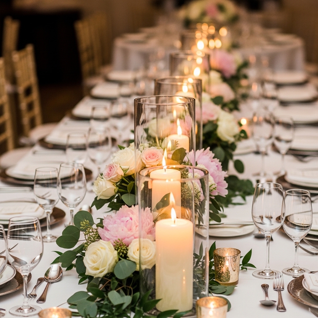 Glass hurricane vases with pillar candles create timeless wedding table decor. The warm glow instantly enhances ambiance.