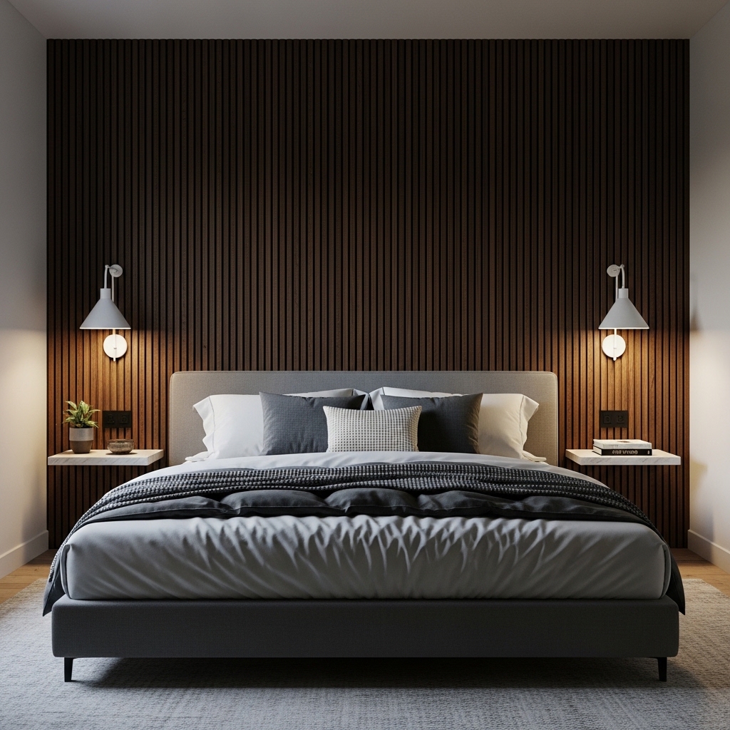 Dark wood slats create a bold and dramatic bedroom accent wall. Shades like walnut, espresso, or dark oak add a luxurious and sophisticated atmosphere.