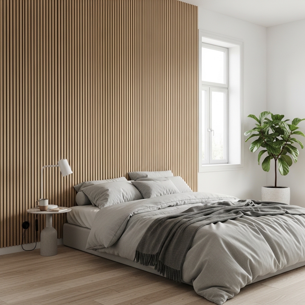Light oak or birch wood slats create a bright and airy Scandinavian bedroom aesthetic. The natural color keeps the room feeling fresh and calming.