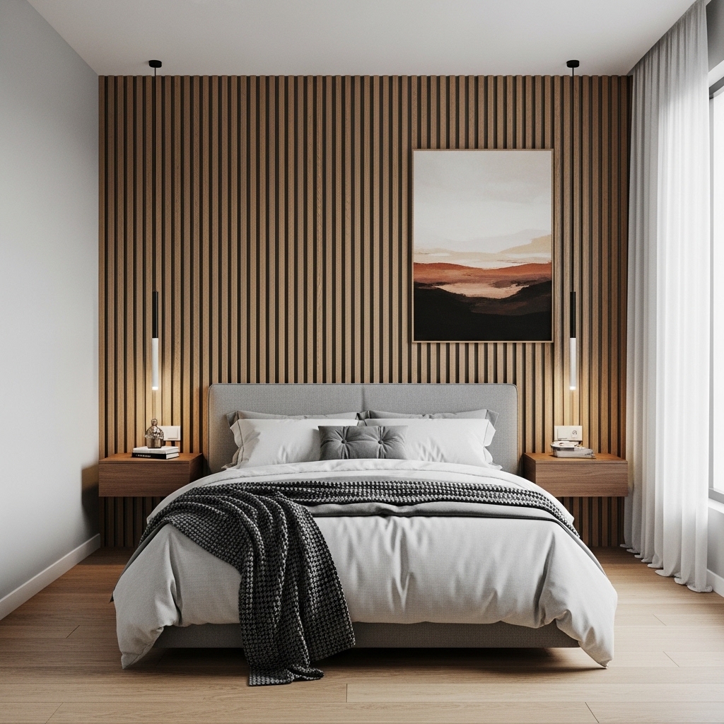 A vertical wood slat accent wall behind the bed creates a beautiful focal point that immediately draws attention. The clean vertical lines add height to the room, making the ceiling appear taller and the space more open.