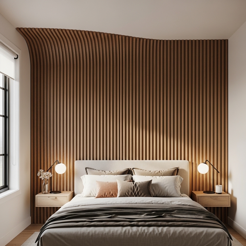 A curved wood slat wall introduces a unique and artistic design element to the bedroom. The curved lines soften the structure of the room and create visual flow.