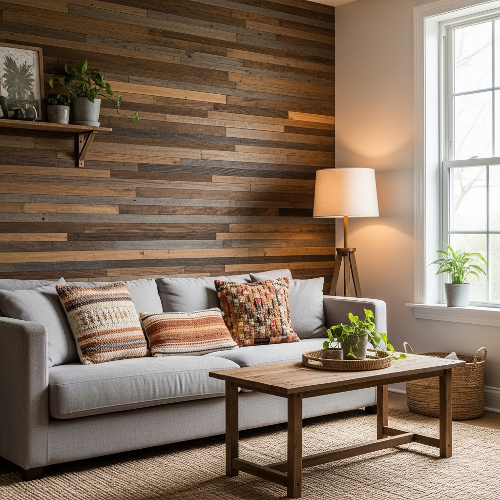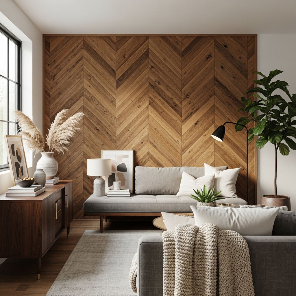 Choose the wall that naturally draws attention. The wall behind the bed. The wall behind the sofa. The wall with the fireplace. Add wood to that wall. Leave the others smooth.