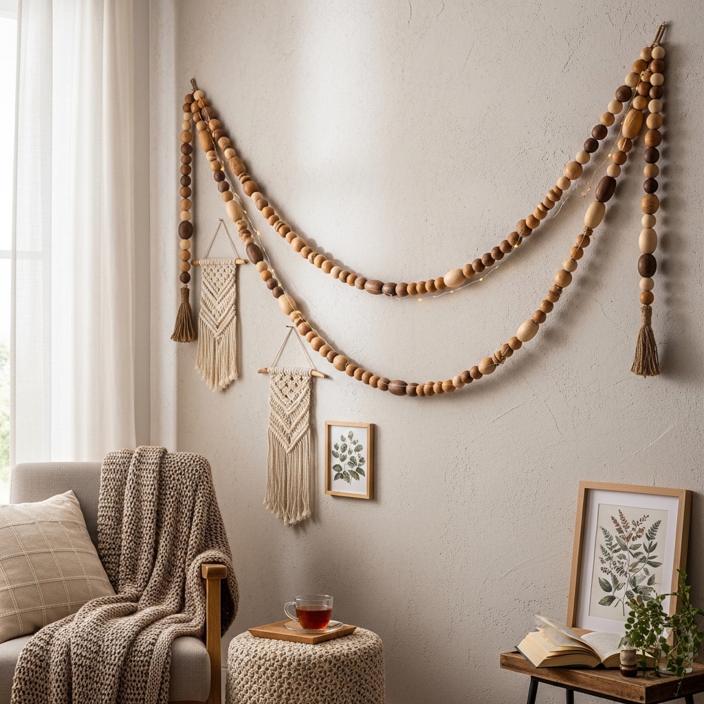7. Wooden Bead Garland Draped Across a Wall