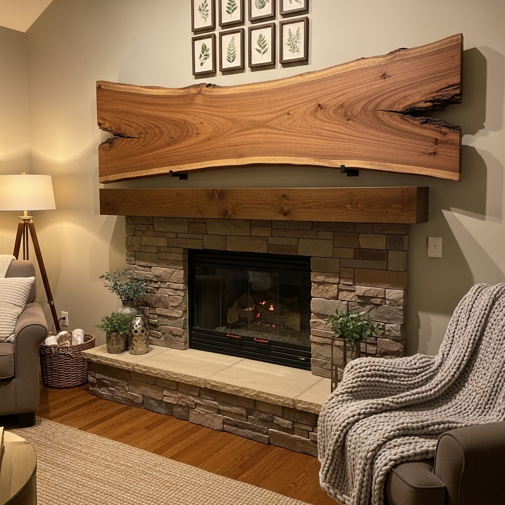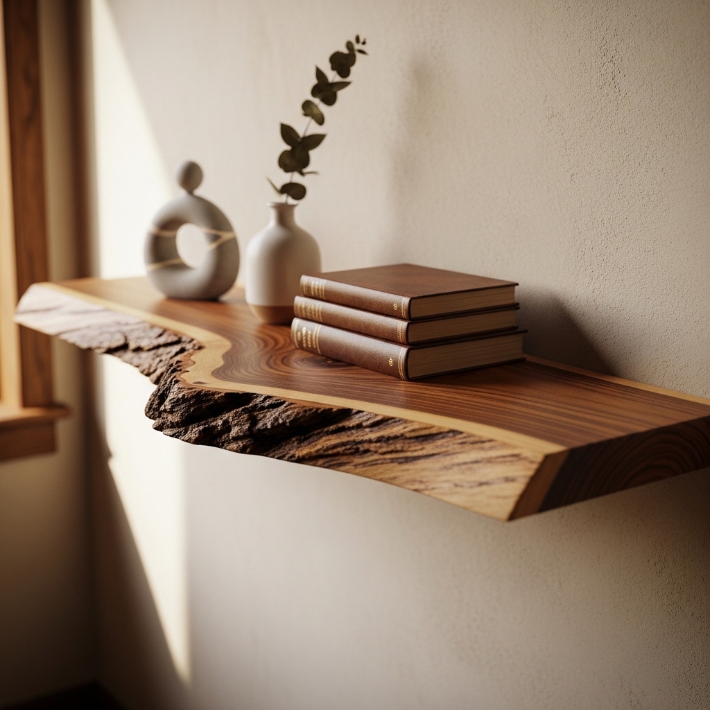 A live-edge shelf is functional. It is also decorative. The natural edge of the wood is the focal point.