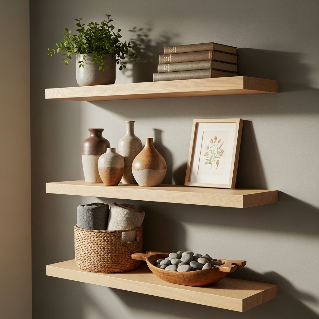 3. Floating Wood Shelves with Curated Objects
