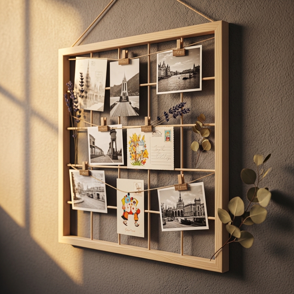 A wooden grid holds photos, postcards, or small prints. The grid adds structure. The wood adds warmth.