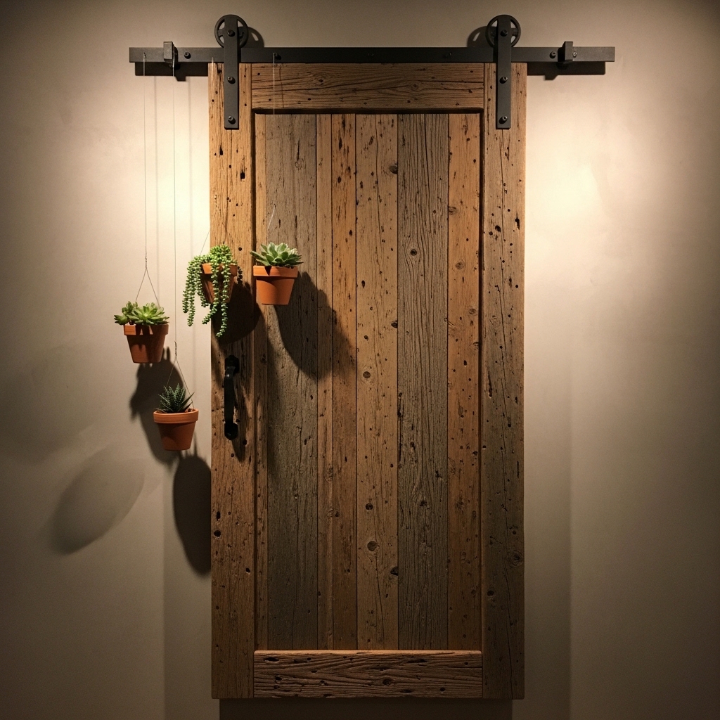A barn door does not have to be on a track. Mount a barn door flat against the wall as art. The hardware becomes part of the piece.