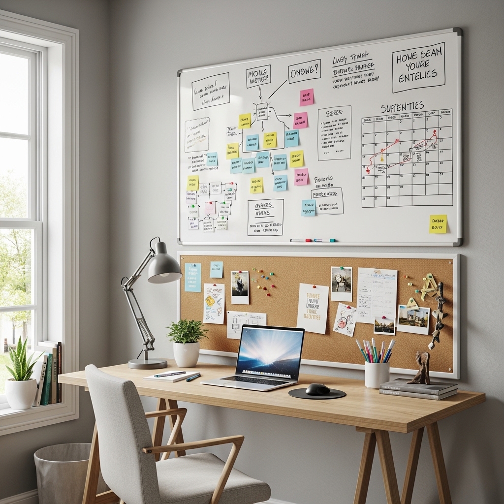 Write daily priorities on the whiteboard. Pin notes, deadlines, and inspiration on the bulletin board.
