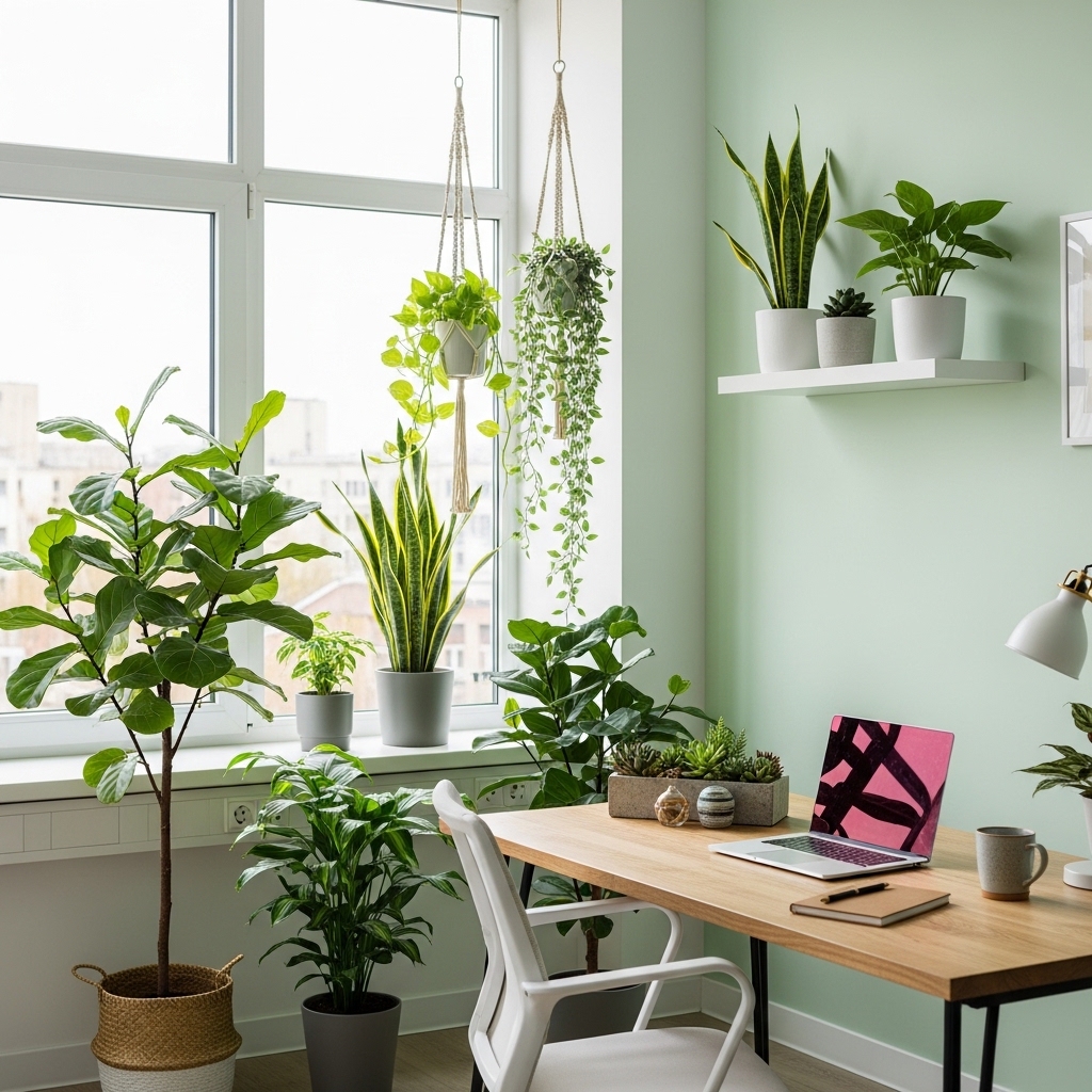 Place three to five low-maintenance plants around your office. Snake plants, pothos, ZZ plants, and peace lilies thrive indoors.