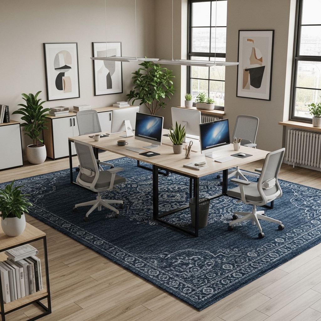 The rug absorbs sound, adds warmth, and defines your workspace within the larger room.