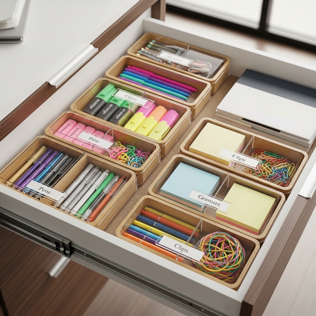 Upgrade your desk surface if it is scratched or ugly. Use drawer organizers for every single drawer.